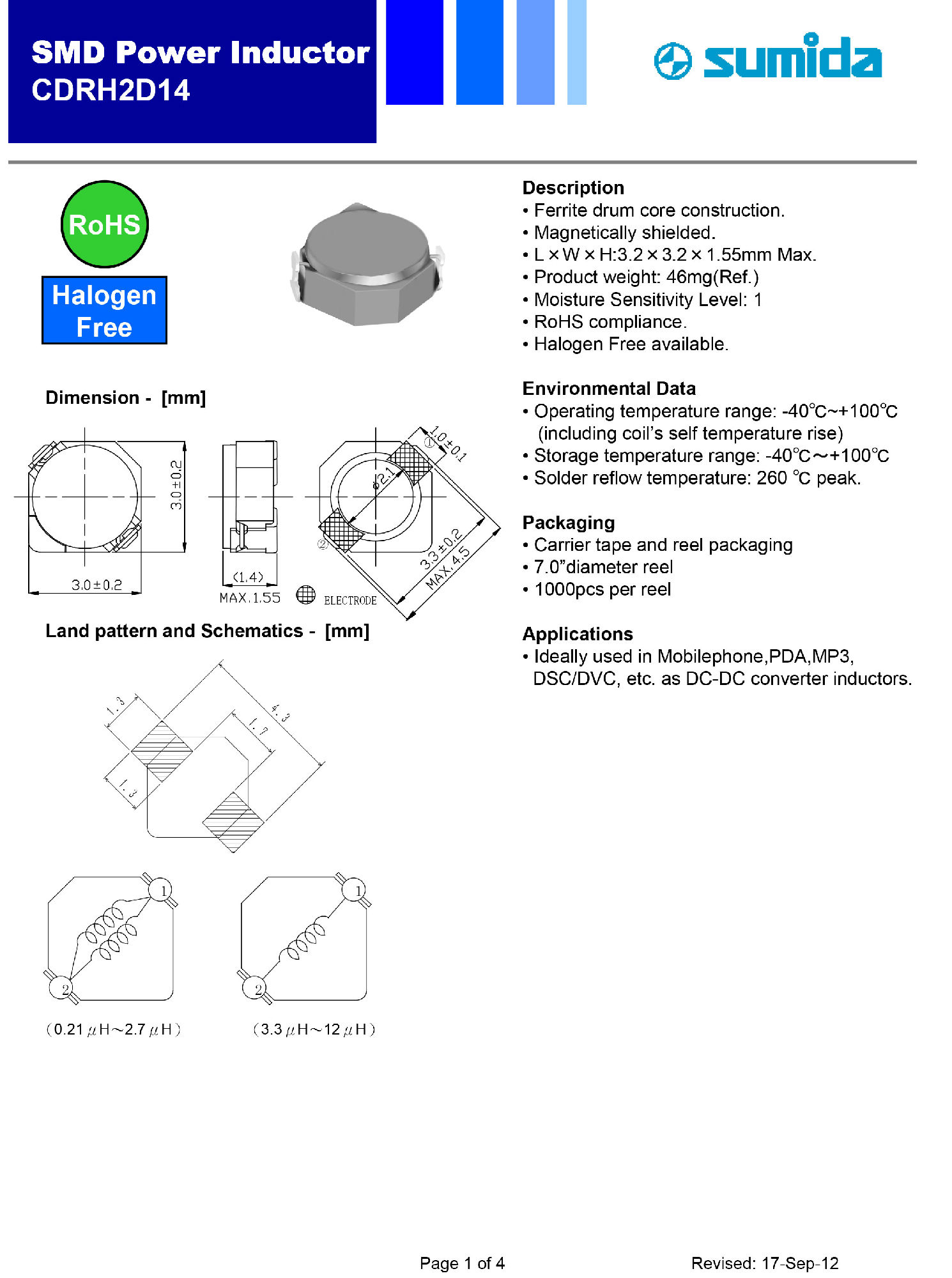 5.CDRH2D14最小包裝1KPCS 6.廣泛應用于各類手持式電子設備的DC-DC電源供電模塊,如移動支付用的掃碼機