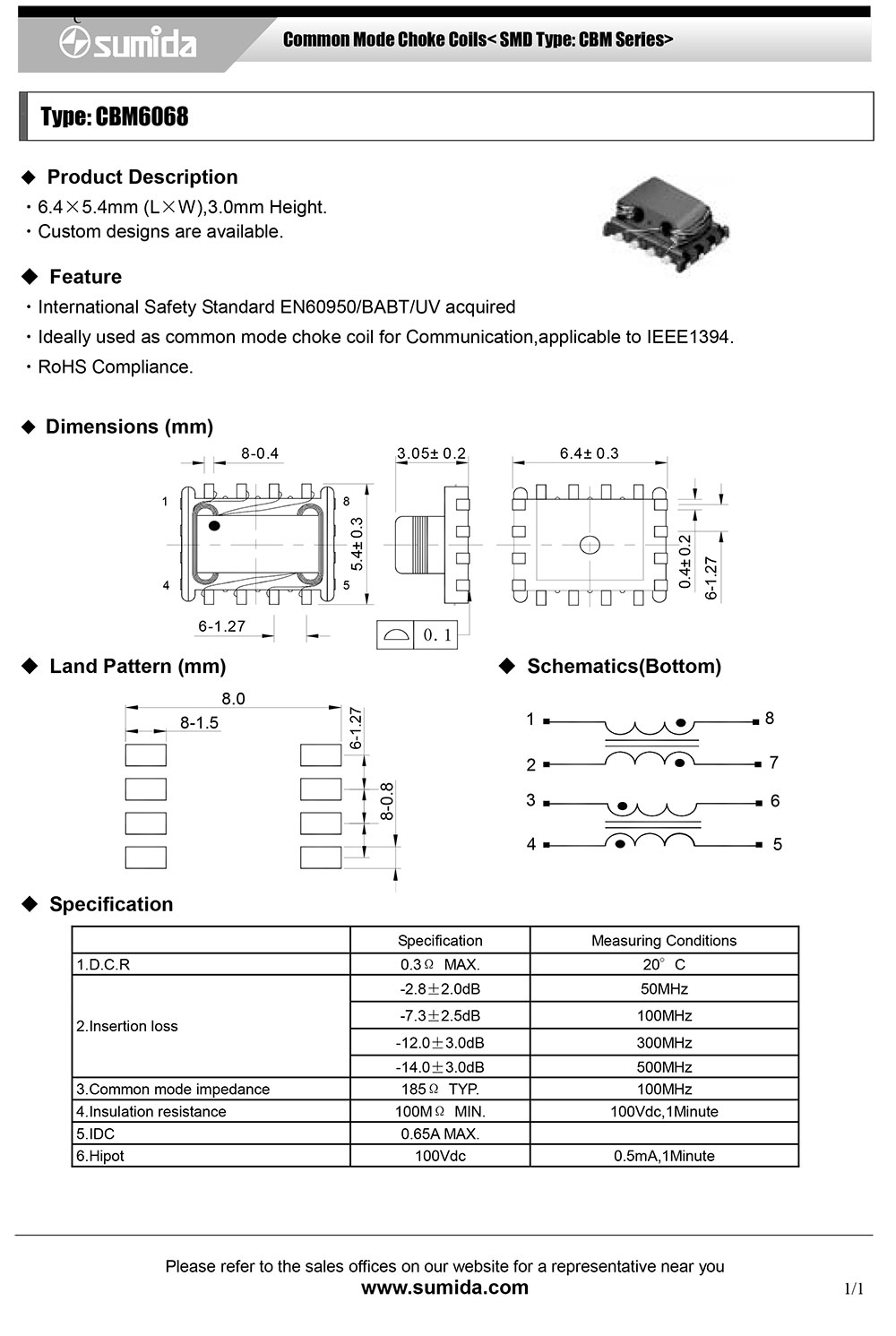 5.符合UL及EN60950安規,CBM6068廣泛用于電信、通訊行業及各類工業板卡的通訊端口的共模信號抑制,適應IEEE1394。