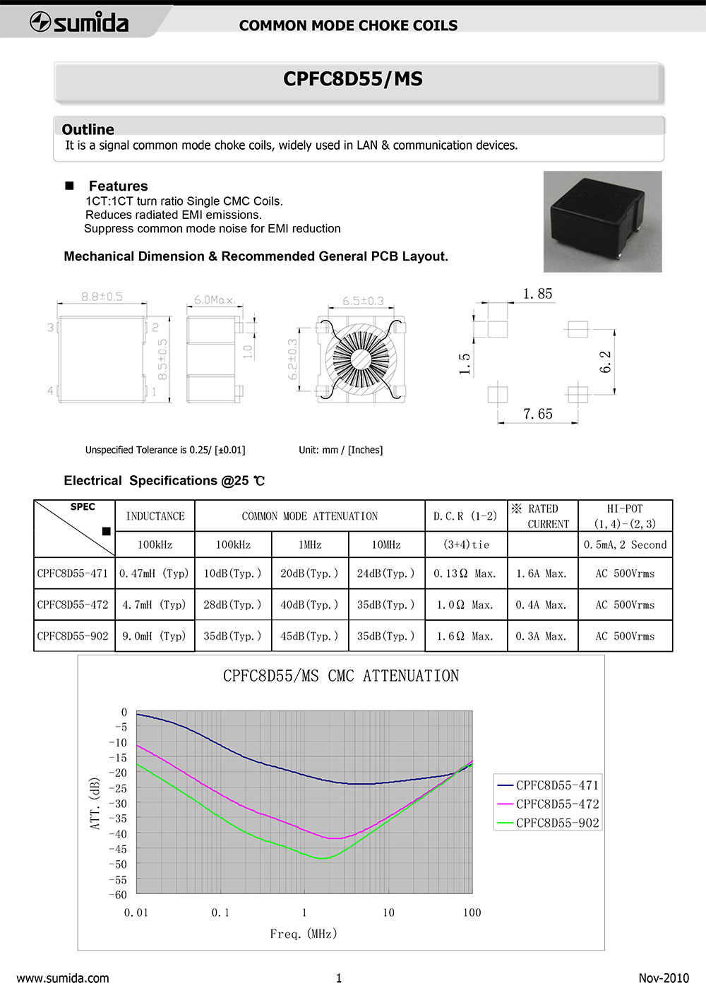 5.CPFC8D55MS廣泛用于電信、通訊行業(yè)及各類(lèi)工業(yè)板卡的通訊端口以及局域網(wǎng)的的共模信號(hào)抑制。