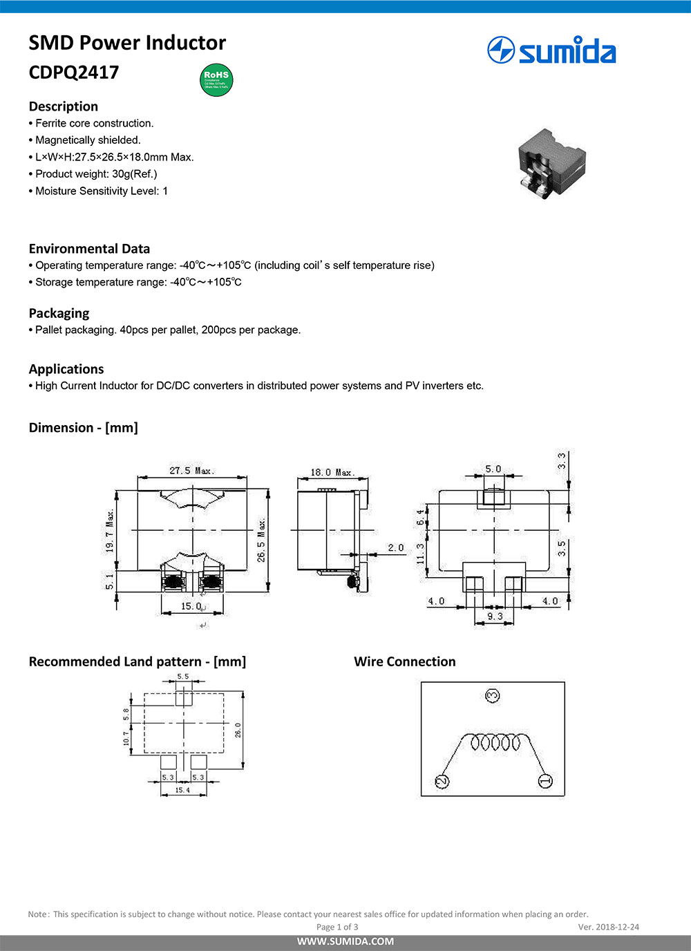 3.L*W*H--27.5*26.5*18mm 4.RoHS,最小包裝300PCS